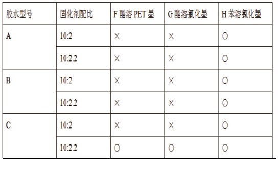 確切來說是指溶劑類型的影響,因為我們以前也使用苯溶油墨,感覺這個問題不明顯,所以這次特意拿來進行對比。由實驗情況看油墨及溶劑選擇是引起這個問題的主要原因之一,究其原因是苯溶油墨吸水性低、墨層挺,消耗固化劑少,而酯溶油墨吸水性高、墨層軟,即使加大固化劑也不能消除其影響,因此只能在酯溶油墨中選擇相對復合效果好一點的了。