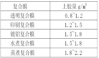 根據復合基材的不同,可以使用不同的上膠量,如下表: