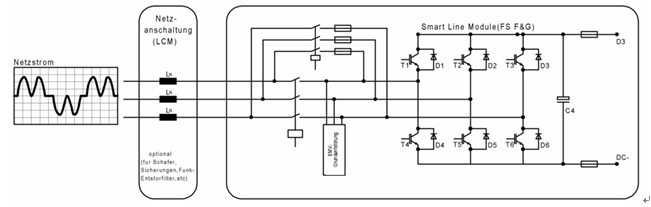 整流/回饋單元把交流電源轉換為電壓穩定的直流電源,即使在逆變器能量回饋到電網時,該電壓在規定范圍內仍保持恒定,其原理如圖3所示。該整流/回饋單元使用IGBT的四象限運行,可以避免由于電網故障等引起的逆變器換向失敗。