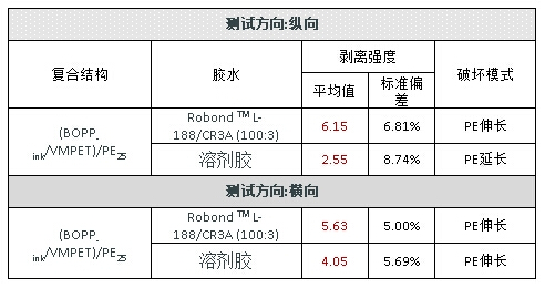 通常適合該結構復合的水性粘合劑為單組分普通型水性粘合劑,該結構產品被廣泛使用在方便面、餅干、蛋黃派以及其他干點食品的包裝上。主要表現的特點是復合強度高,外觀美觀,無鍍鋁轉移問題的發生,對于蛋黃派等充氣包裝,可有效減少包裝漏氣率的發生。