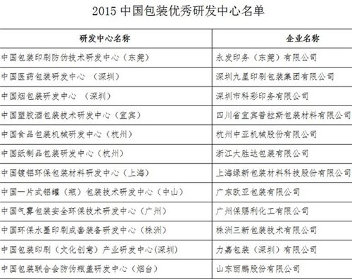 根據(jù)《關(guān)于開展2015中國包裝優(yōu)秀研發(fā)中心評選活動的通知》(中包聯(lián)技字[2015]34號)和《中國包裝聯(lián)合會關(guān)于包裝行業(yè)研發(fā)中心管理辦法(試行)》的規(guī)定,經(jīng)中國包裝聯(lián)合會會長辦公會議研究,決定授予力嘉包裝(深圳)有限公司的“中國包裝印刷(文化創(chuàng)意)產(chǎn)業(yè)研發(fā)中心(深圳)”等12家單位為“2015中國包裝優(yōu)秀研發(fā)中心”。