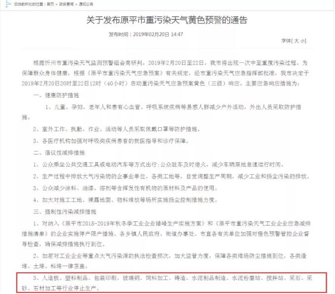 根據山西省忻州市重污染天氣監測預警組會商研判,2019年2月20日至22日,原平市將出現一次中至重度污染過程。為保障群眾身體健康,根據《原平市重污染天氣應急預案》有關規定,經市重污染天氣應急指揮部批準,原平市決定于2019年2月20日20時至22日12時(40小時)啟動重污染天氣應急預案黃色(三級)響應。主要應急響應措施包括:人造板、塑料制品、包裝印刷、玻璃鋼、飼料加工、鑄造、水泥制品制造、水泥粉磨站、攪拌站、采石、采砂、石材加工等行業停止生產。