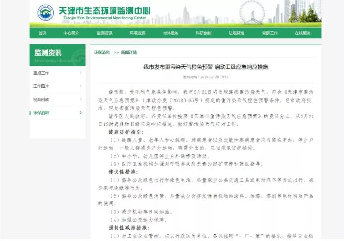 受不利氣象條件影響,天津市2月21日出現連續重污染天氣,符合《天津市重污染天氣應急預案》(津政辦發〔2018〕65號)規定的重污染天氣橙色預警條件,經市政府批準,發布了重污染天氣橙色預警,要求各區人民政府、各責任單位按照《天津市重污染天氣應急預案》的責任分工,從2月21日12時起啟動Ⅱ級應急響應措施,做好重污染天氣應對工作,并采取了強制性減排措施: