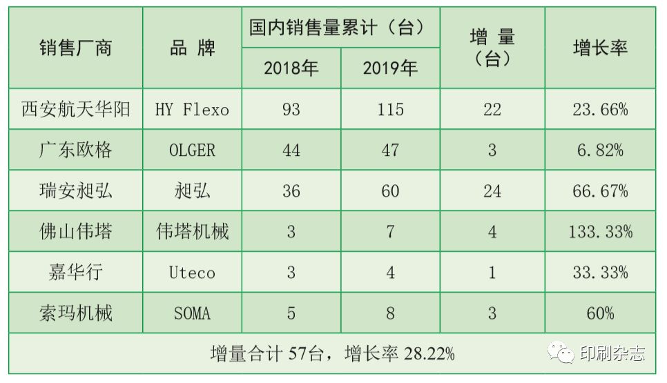 中國印協柔印分會對活躍在中國市場上著名寬幅衛星式柔印機的5家國產制造廠商和4家國外品牌代理商發出了2019年度銷售情況調查的請求,共得到8家企業的反饋,其中6家有銷售數量,統計數據見表。