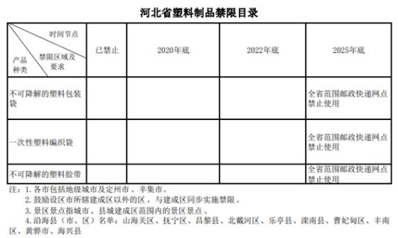 到2020年底,石家莊市城市建成區和張家口市崇禮區建成區的商場、超市、藥店、書店等場所以及餐飲打包外賣服務和各類展會活動,禁止使用不可降解塑料袋,集貿市場規范和限制使用不可降解塑料袋。