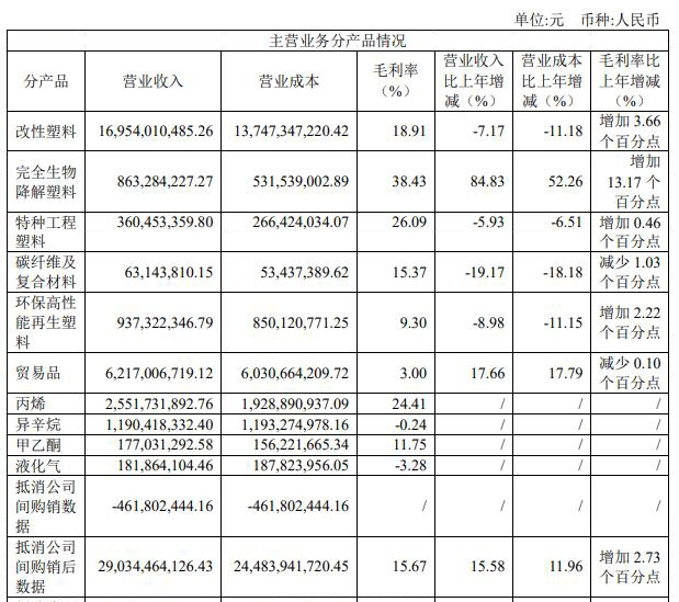 從主營產品毛利率情況看,改性塑料、完全生物降解塑料、特種工程塑料以及環保高性能再生塑料毛利率比2018年均有不同程度增加。
