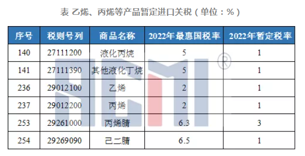2022年1月1日起,我國將對954項商品實施低于最惠國稅率的進口暫定稅率。其中針對液化丙烷、液化丁烷、乙烯、丙烯、丙烯腈、己二腈等,可以看到2022年暫定進口稅率均大幅低于最惠國稅率,除丙烯腈進口稅率調至3%以外,其他5大類產品稅率均調至1%。