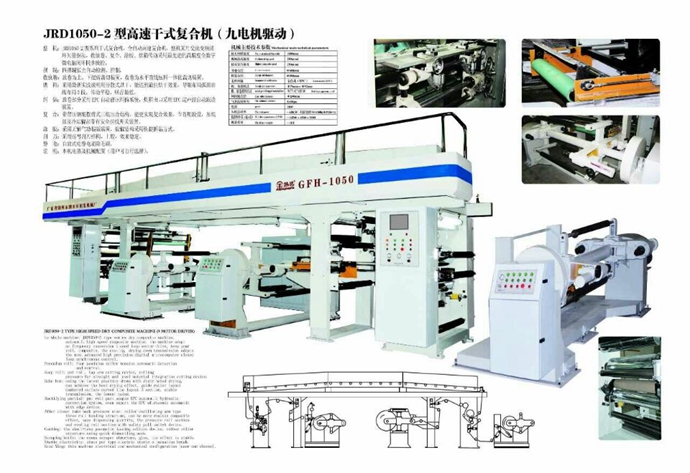 整機:JRD1050-2型系列干式復合機,全自動高速復合,采用交流變頻閉環矢量驅動,收放卷、復合、涂膠、烘箱傳動采用最先進的高精密全數字微電腦閉環同步操控;