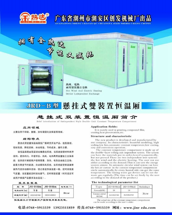 結構特點:懸掛式雙裝置恒溫廂是我廠新研究開發產品,造型美觀、密封性高、降低損耗、自動恒溫、節約成本、操作方便;該恒溫廂是由雙層滾動軸懸掛系統,該系統能使材料有序排列,受熱均勻、不受擠壓;熱風、電熱兩用裝置獨立交換系統,該系統可根據用戶使用需要,熱風、電熱自由獨立交換,能最大限度節約能源;自動循環風系統,該系統能使恒溫廂里面熱氣流自動循環流動,使之各受熱面溫度一致;定時排放廢氣裝置,該裝置能定時排出廢氣(時間設定可由用戶根據產品要求自由設定)